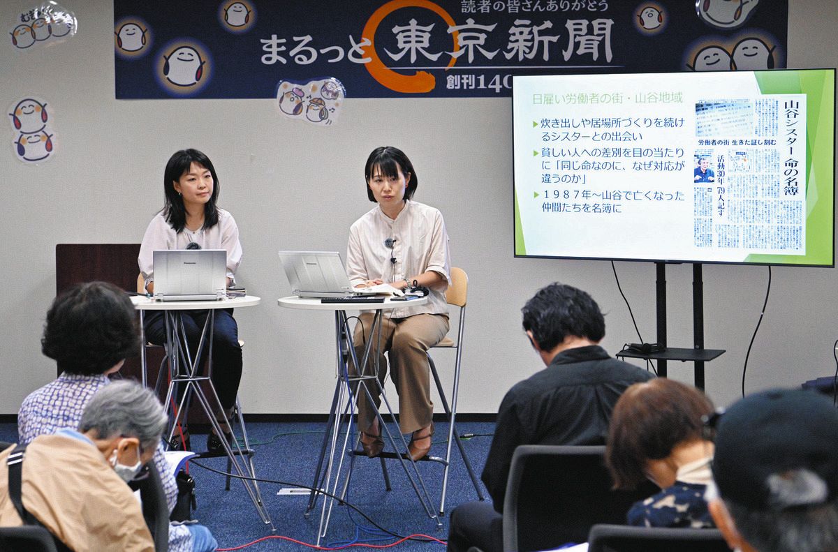 東京新聞は3日、創刊140周年感謝イベント「まるっと東京新聞-読者の皆さんありがとう」の企画で記者が日替わりで登場する「記者サロン」を本社(千代田区内幸町)で開いた。音声番組「新聞記者ラジオ」特別編の公開収録として、社会部の中村真暁記者と奥野斐記者が取材への思いや記事の裏話を語った。
