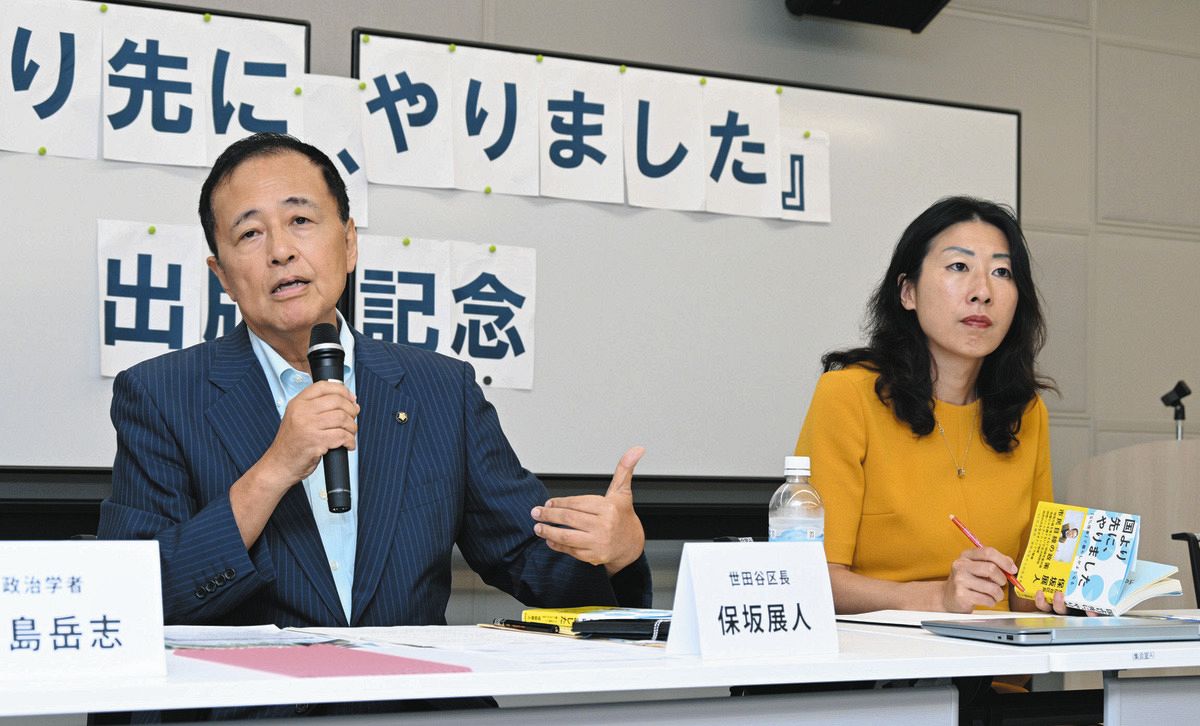 都内で講演する世田谷区の保坂展人区長。右は杉並区の岸本聡子区長=2日、須藤英治撮影