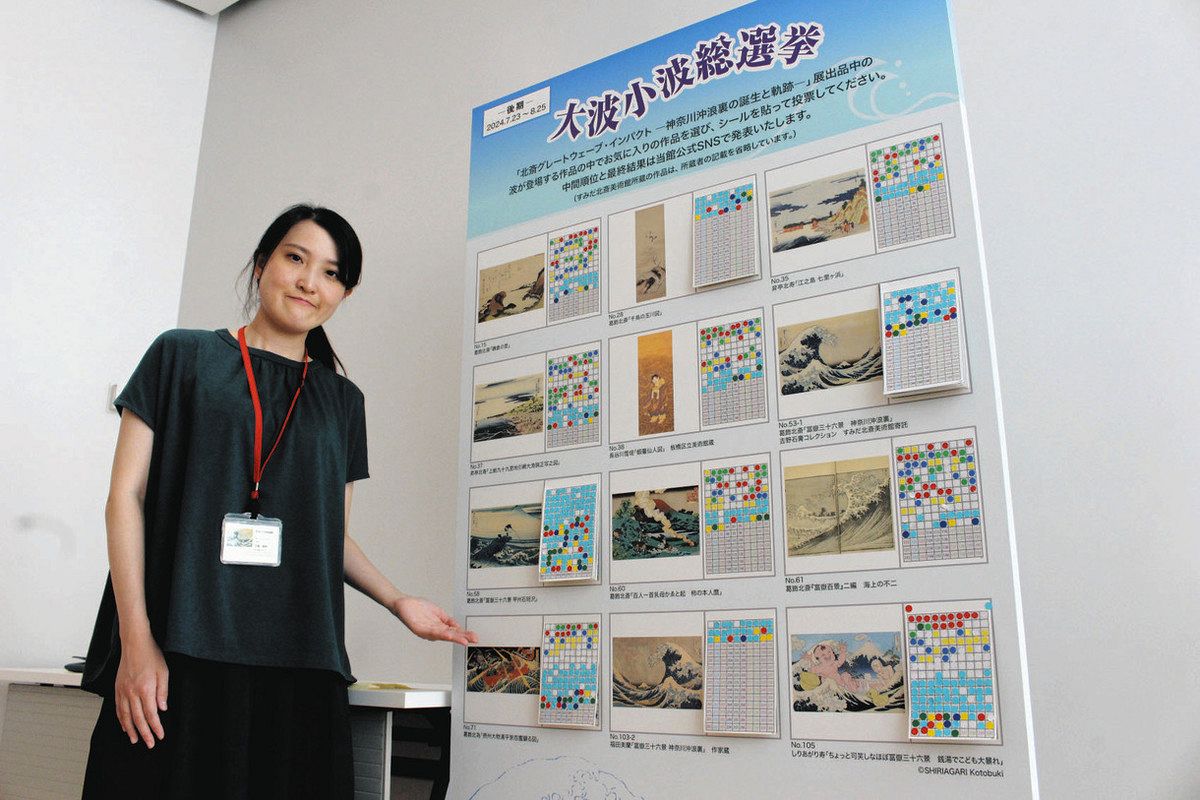 江戸時代の画家葛飾北斎が得意とした波の作品と、北斎に影響を受けた画家らの波をモチーフにした作品を展示し、来場者に好きな絵を選んでもらう企画「大波小波総選挙」が、東京都墨田区のすみだ北斎美術館であった。北斎の代表作で、新千円札の裏面にもあしらわれている「冨嶽三十六景神奈川沖浪裏」が圧倒的な人気で1位になった。