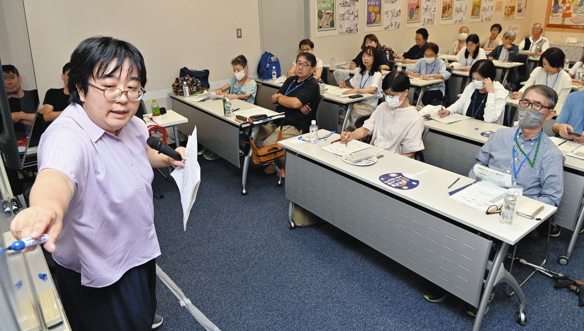 講師はクイズ本出版社「ニコリ」の荒井奈緒さん。「いかこ先生」として本紙など数多くのメディアに解説役として出演している。