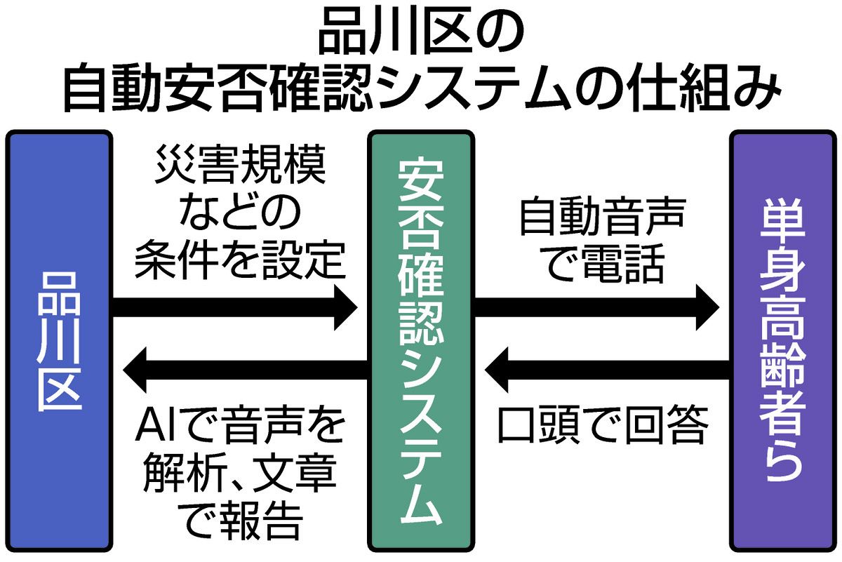 地震や台風などの災害に備え、東京都品川区は来年3月から、事前登録した単身高齢者らに、自動音声の電話をかけて安否を確認するシステムの運用を始める方針を決めた。高齢者らが口頭で答えた安否情報を人工知能(AI)で解析し、消防への通報などの対応につなげる。