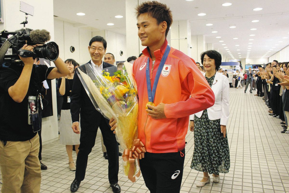 パリ五輪のフェンシング男子フルーレ団体で金メダルを獲得した東京都台東区出身の松山恭助選手(27)が10日、区役所を訪れた。