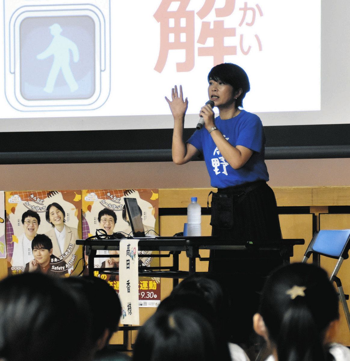 この日、香さんは前野小近くの横断歩道や公園の写真を示しながら、交通ルールを説明。「ルールを守っていても命を落とすことがある。小さい子も、自分の命は自分で守る意識を持ってほしい」と呼びかけた。