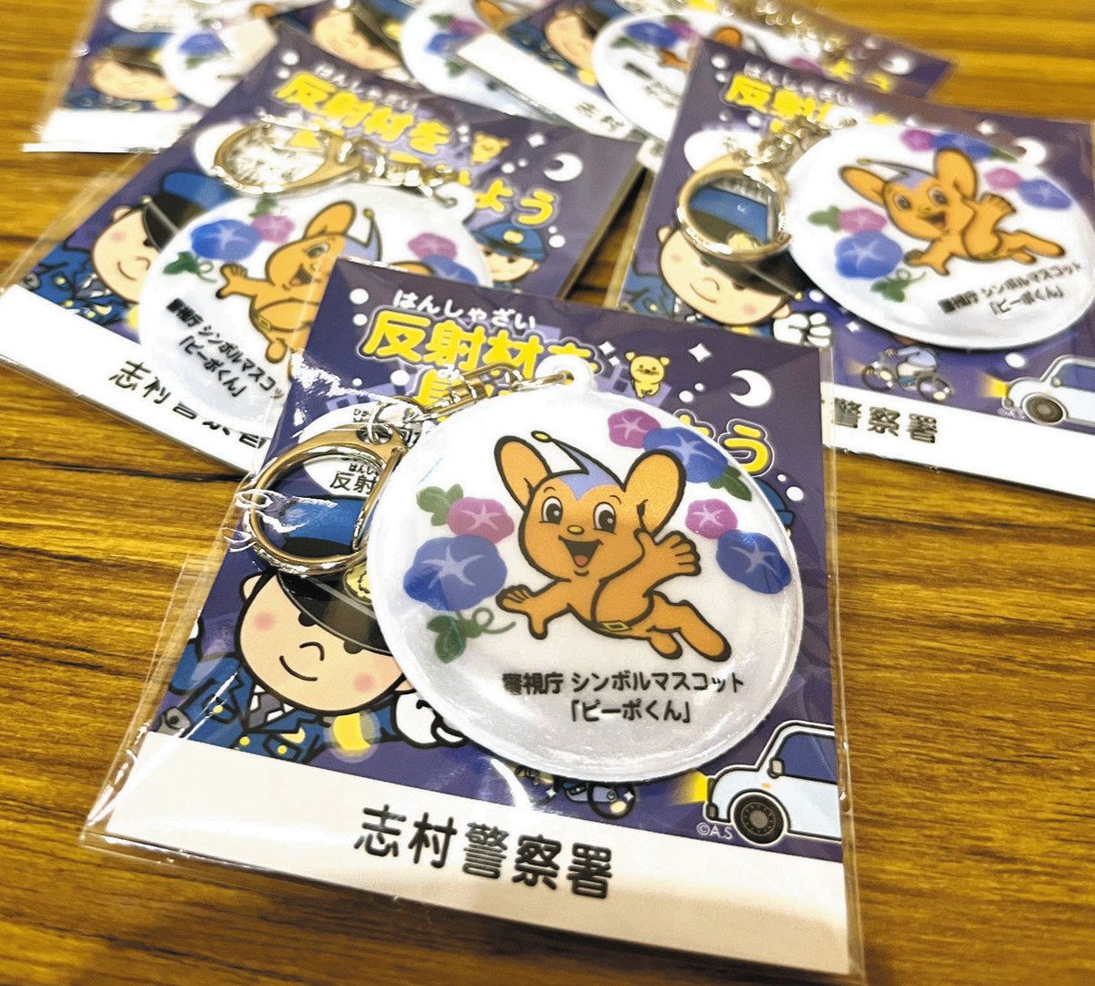 ピーポくんとアサガオがあしらわれた、オリジナルの反射材