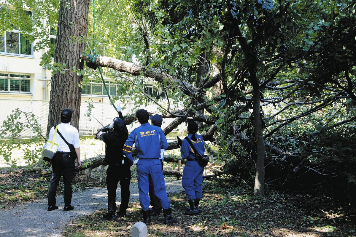 枝が折れて落ちた状況を調べる捜査員ら=13日、東京都日野市で