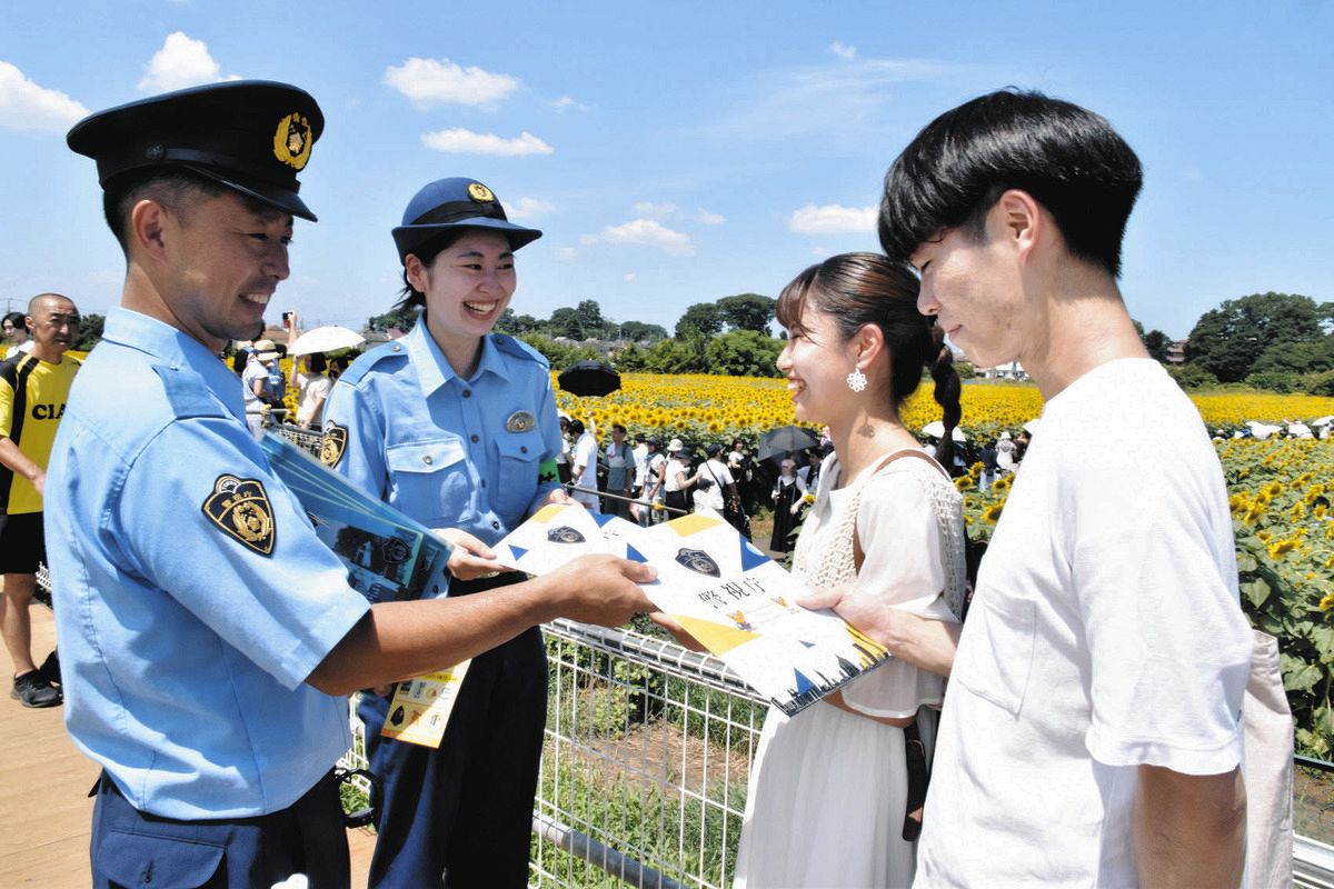 「警察官、興味ありませんか?」。8月中旬、清瀬市で開かれた「清瀬ひまわりフェスティバル」の会場で、東村山署員が「勧誘」を実施した。約10万本のヒマワリを目当てに訪れたカップルや親子連れらに話しかけ、パンフレットを配る。