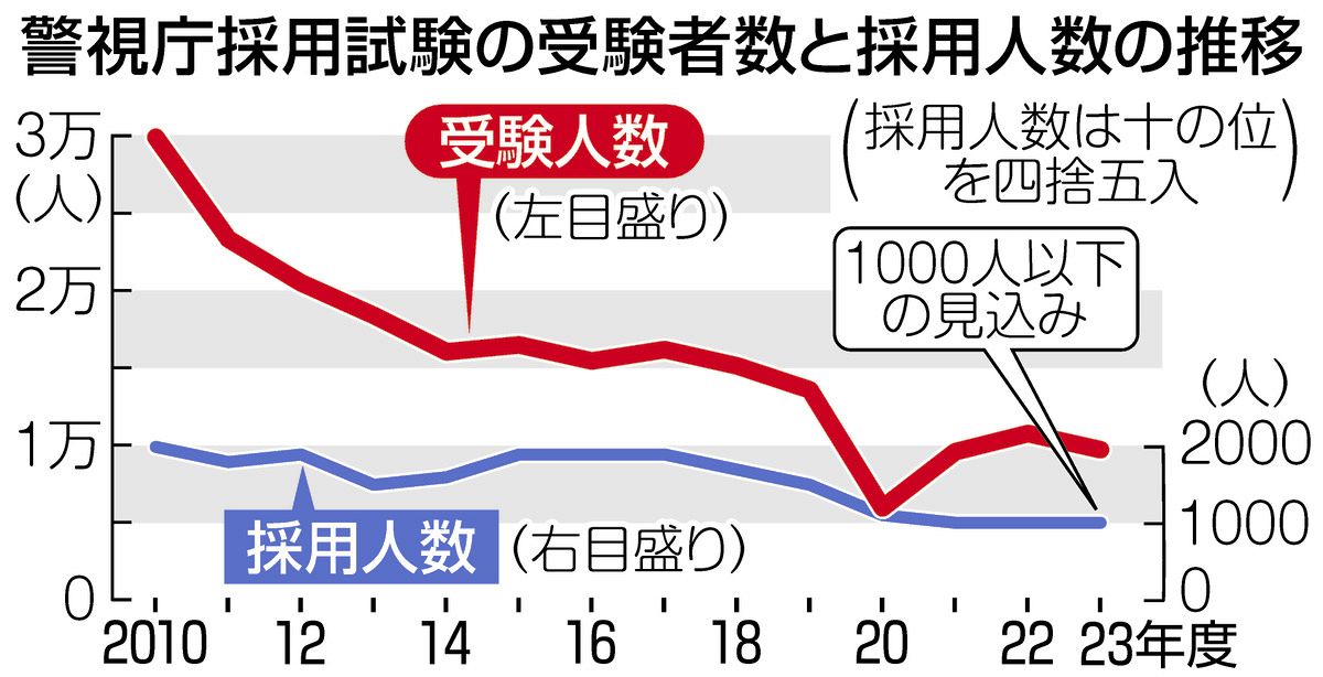 警視庁の採用試験の受験者数は2010年度には約3万人だったが、その後は右肩下がりに転じ、2023年度は約9700人に落ち込んだ。合格者の辞退率も約4割に上る。警察庁によると、全国の警察官採用試験の受験者数も2014年度の約9万7000人から2023年度は約4万8000人と半減しているが、警視庁の方が減少率が高い。