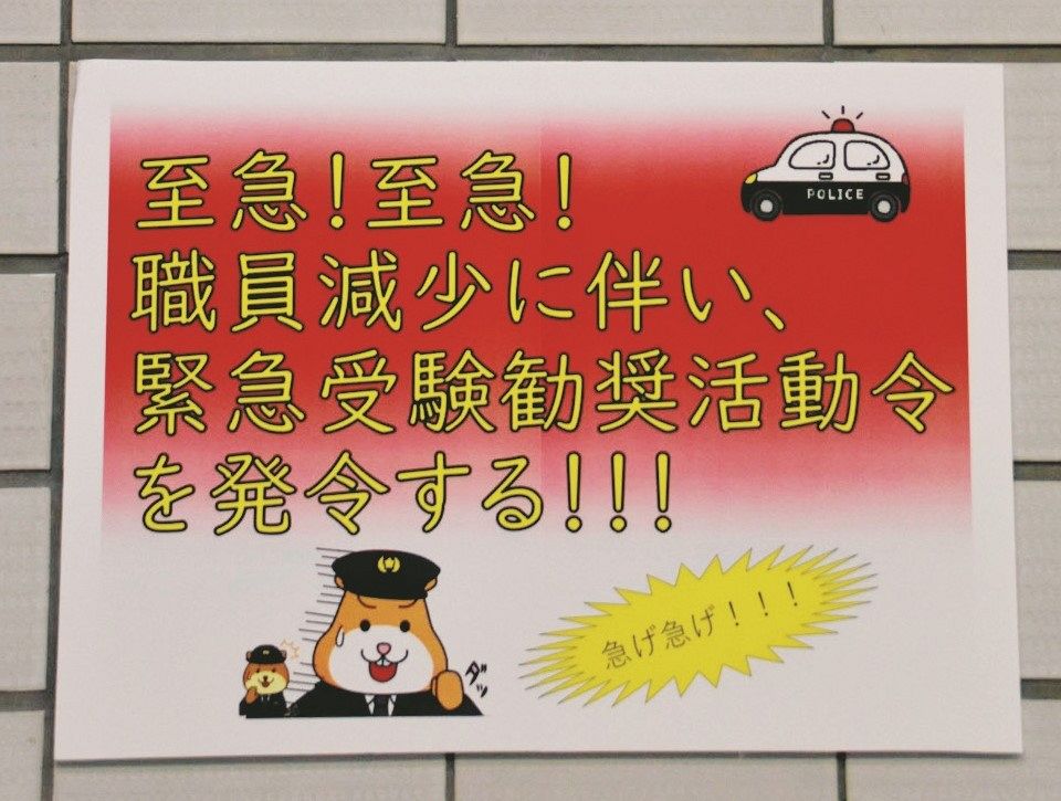 職員にも協力を呼びかける。警視庁本部庁舎の1階には8月、「1人の職員が1人受験勧奨すれば4万人は受験するはずだ!」「至急!至急!職員減少に伴い、緊急受験勧奨活動令を発令する!」という、危機感にあふれた文言のポスターが張られた。多くの受験生を勧誘できた職員を表彰する取り組みも展開。各署でもイベントを開いたり、地元ラジオ局で採用情報を発信したりしている。