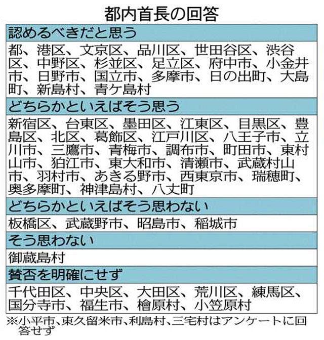 反対首長は「国民各層の意見や国会議論の動向を注視したい」(板橋区長)、「混乱が生じないよう慎重に検討を」(昭島市長)などとした。