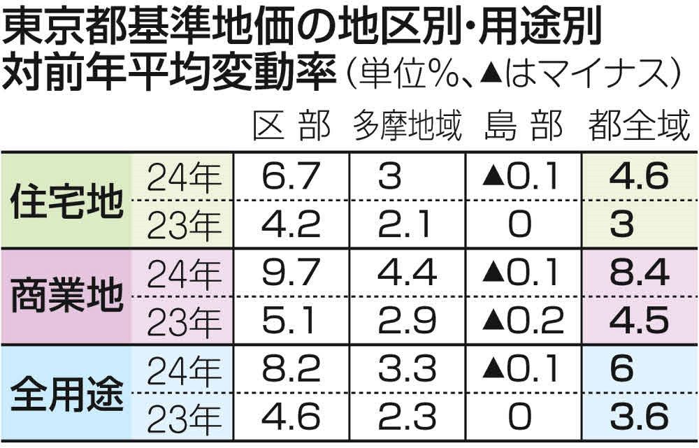 住宅地は前年比4.6%の上昇で、12年連続のプラス。都の担当者は「都心のオフィスに通勤しやすい地域の人気が高まっているほか、都心のマンションは富裕層の投資ニーズも見られる」と説明した。(押川恵理子)