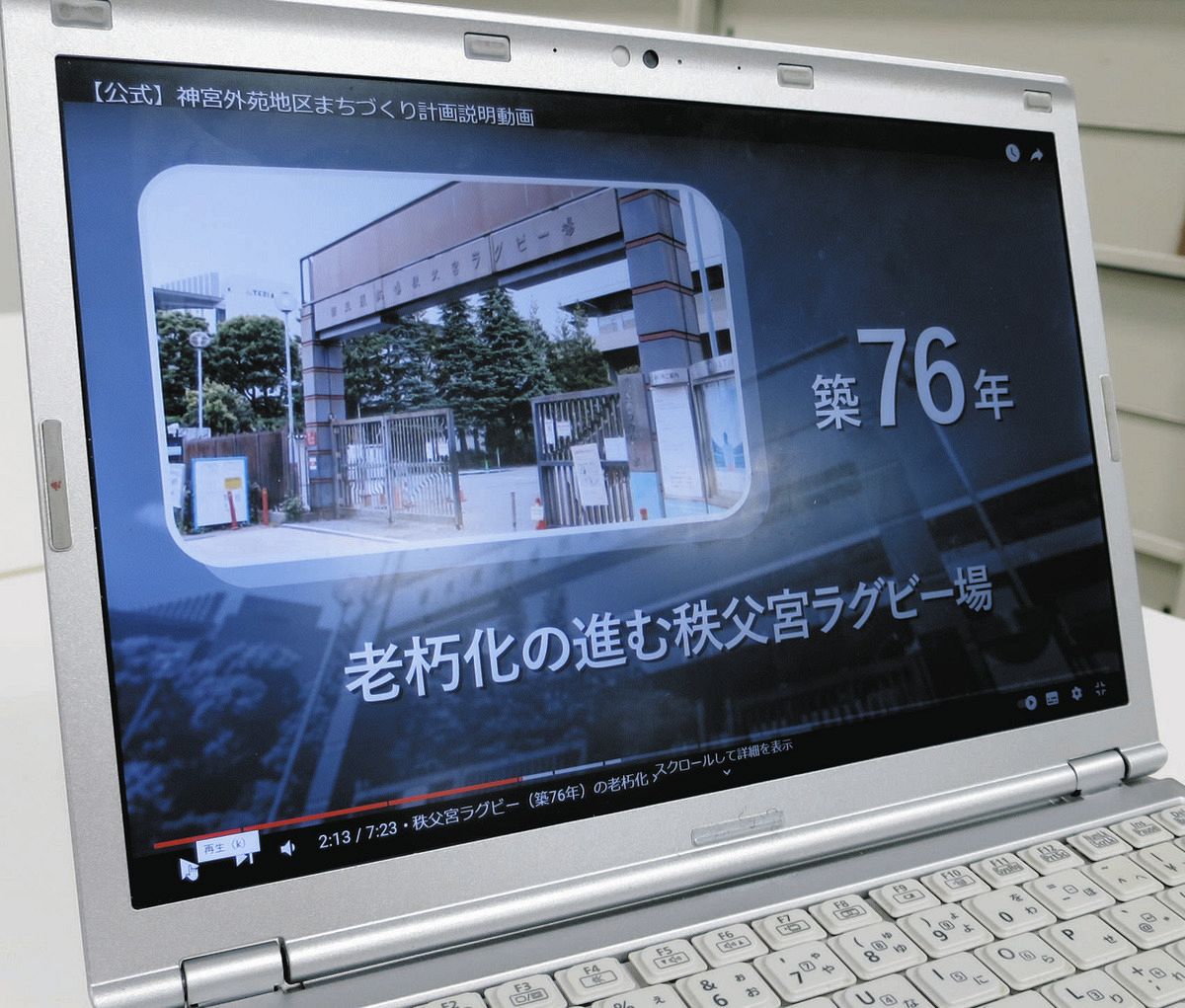 秩父宮ラグビー場について「築76年」と紹介する明治神宮外苑再開発計画の動画