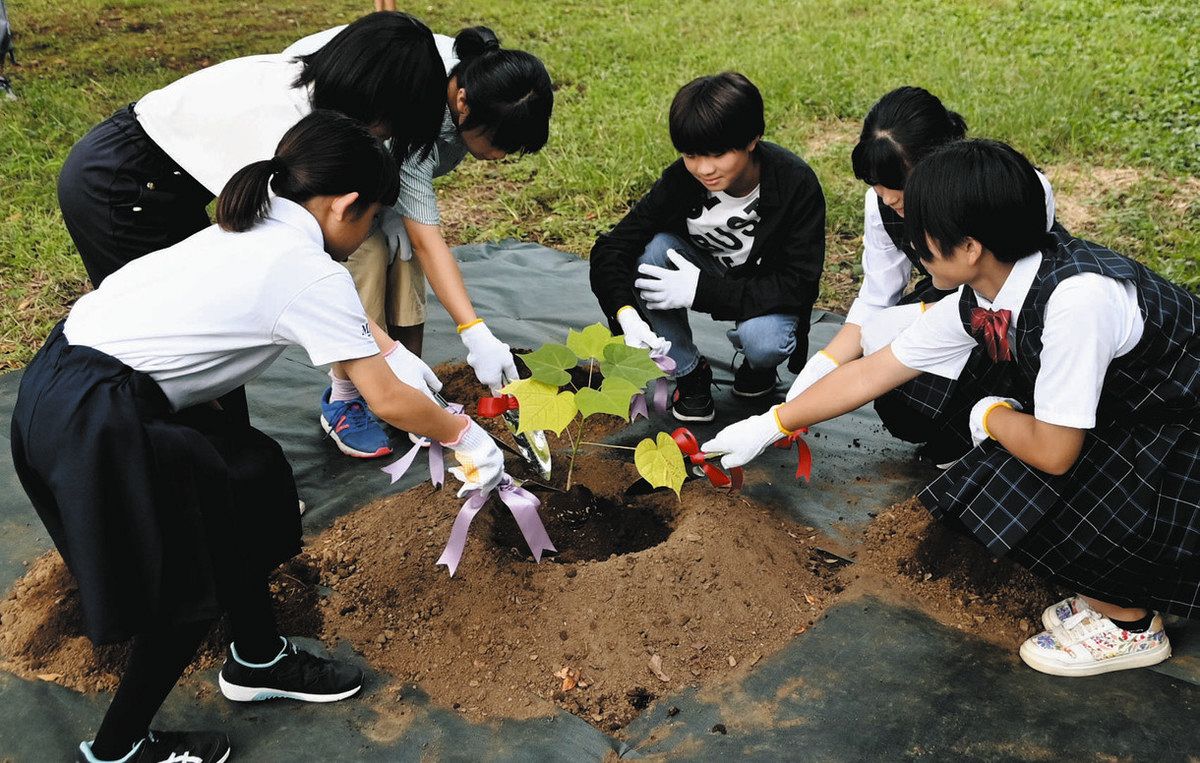 「被爆アオギリ」の苗木を植樹する子どもら=日野市で