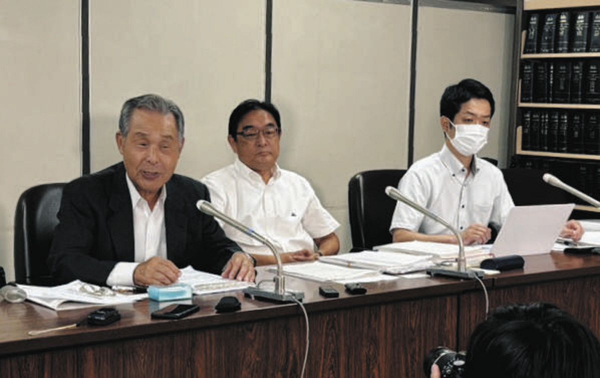 判決後の記者会見に臨む須永知男さん(左)と鳥海準弁護士(中)=20日、東京・霞が関の司法記者クラブで