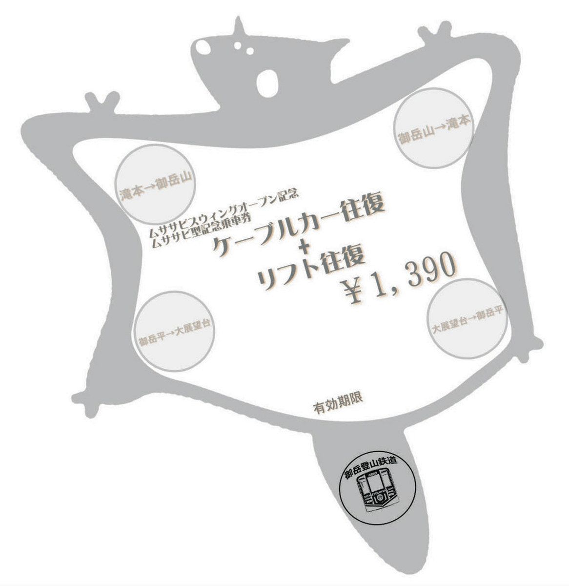 イベントでは、今年6月に山頂近くに設置された2人乗り展望ブランコ「みたけムササビスウィング」をデザインした限定記念乗車券を販売。ケーブルカーと観光リフトの往復乗車券で大人1390円。限定500枚。