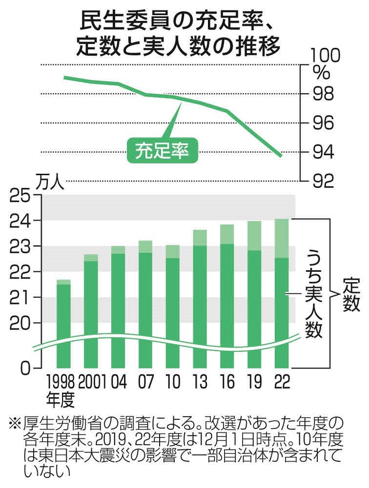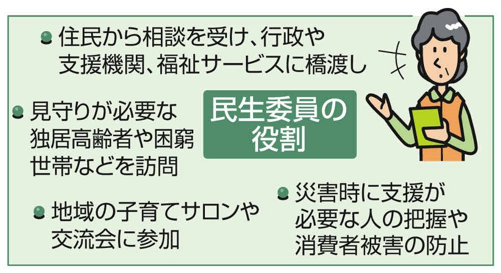 民生委員地域住民の身近な相談相手で、支援が必要な場合に行政や福祉サービスにつなぐ役割を担う。民生委員法に基づき、町内会などが地域住民から候補を選び、都道府県知事の推薦を受け、厚労相が委嘱する非常勤の地方公務員。1917年に岡山県で創設された「済世顧問」制度が始まりとされ、全国各地に広まった。ボランティアのため無報酬。任期は3年で再任も可。子どもを見守り、子育て世帯の悩みを聞く児童委員も兼ねる。2022年の平均年齢は66歳。男女比は4対6。