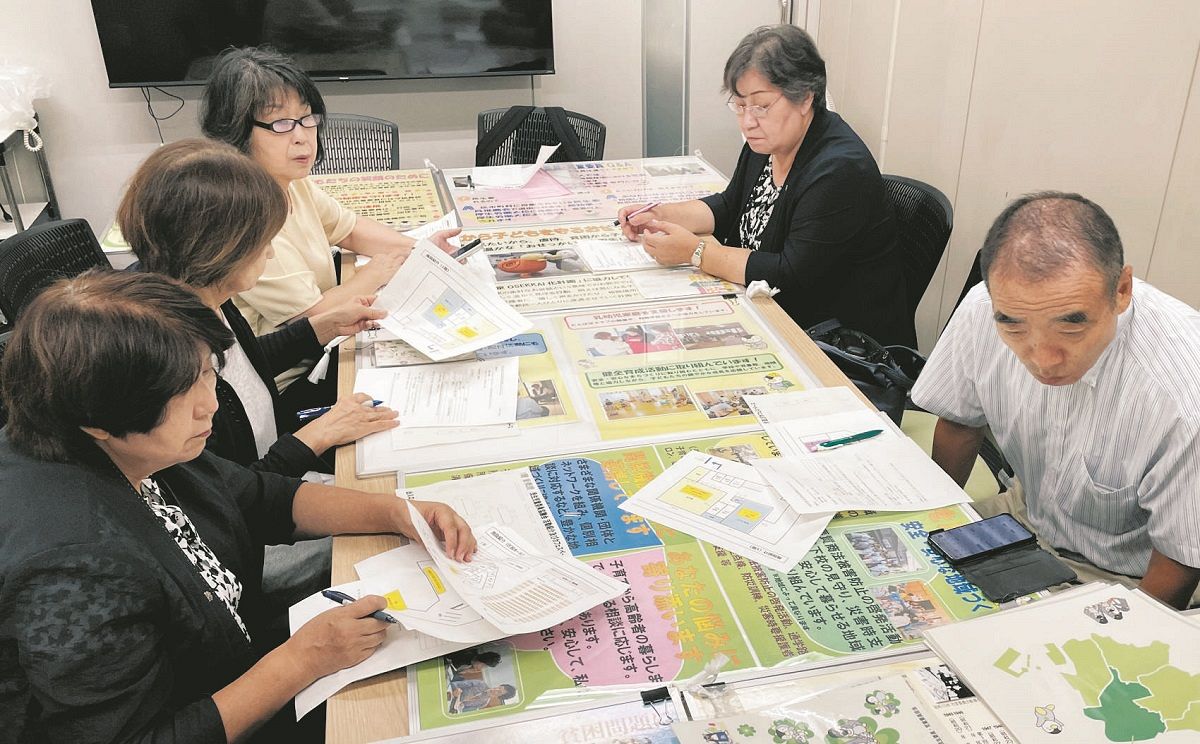 東京・港区の催しで展示する活動PR用のパネルを選ぶ民生委員たち=東京都港区役所で