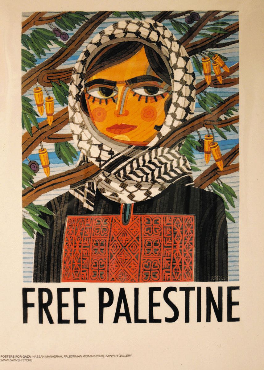 展示しているのは、1~4月にアラブ首長国連邦(UAE)のドバイで開催されたポスター展に出品された作品の一部。パレスチナ文化研究者の長沢美抄子さん(69)が複製を購入した。4月から横浜や池袋など国内各地を回って展示を続けている。