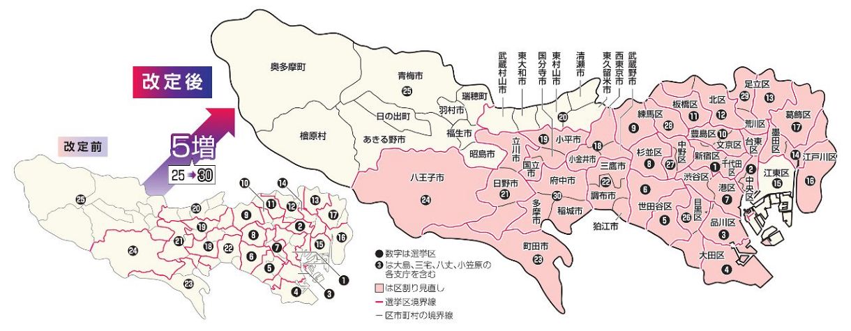 新設されたのは、①26区(目黒区、大田区西部)②27区(中野区、杉並区東部)③28区(練馬区東部)④29区(荒川区、足立区西部)⑤30区(府中市、多摩市、稲城市)―の5選挙区。