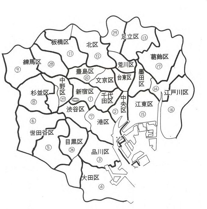 ▶千代田区▶中央区▶港区▶新宿区▶文京区▶台東区▶墨田区▶江東区▶品川区▶目黒区▶大田区▶世田谷区▶渋谷区▶中野区▶杉並区▶豊島区▶北区▶荒川区▶板橋区▶練馬区▶足立区▶葛飾区▶江戸川区▶多摩地域▶島しょ部