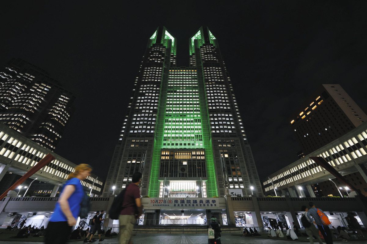緑色にライトアップされた東京都庁=16日、東京都新宿区で(布藤哲矢撮影)