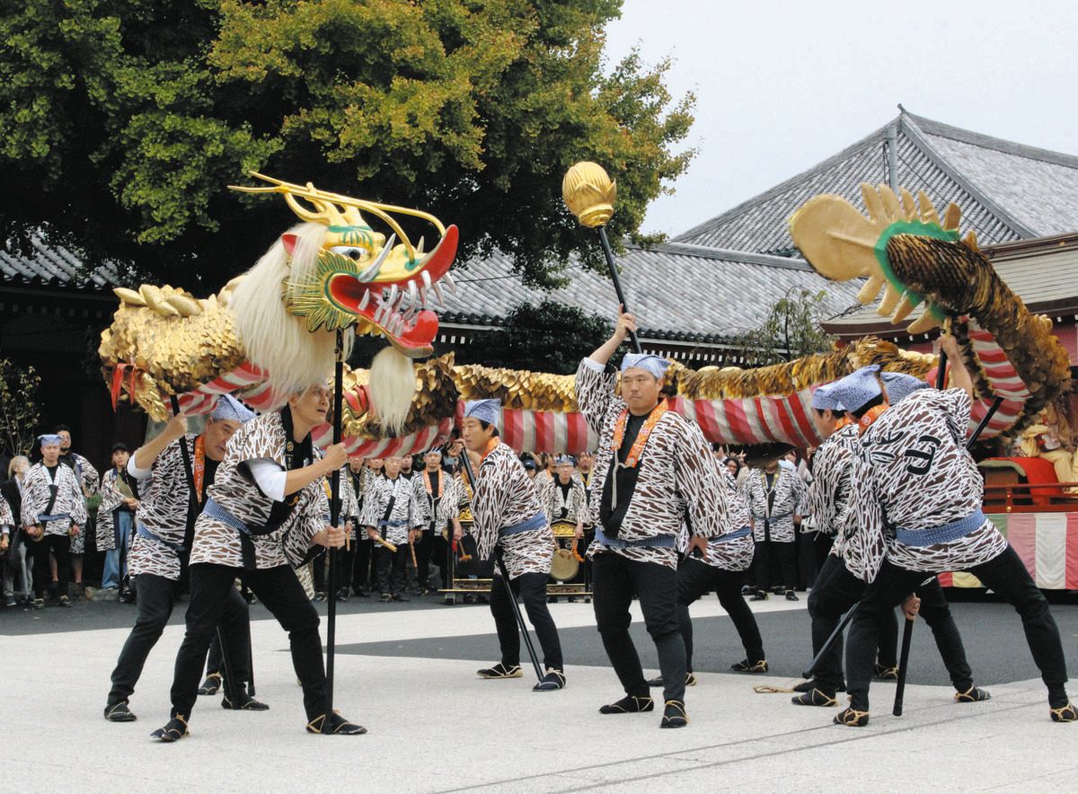 飛鳥時代に浅草寺の本尊が隅田川から引き上げられた際に「天空から金龍が舞い降りた」とされる伝説に由来する。18日は8人で操る金龍と、先導役の1人が雷門を出発すると、ぴたりと小雨がやんだ。仲見世を練り歩き、境内で舞を披露。生きているかのような力強く滑らかな舞に、見物客らが歓声を上げた。