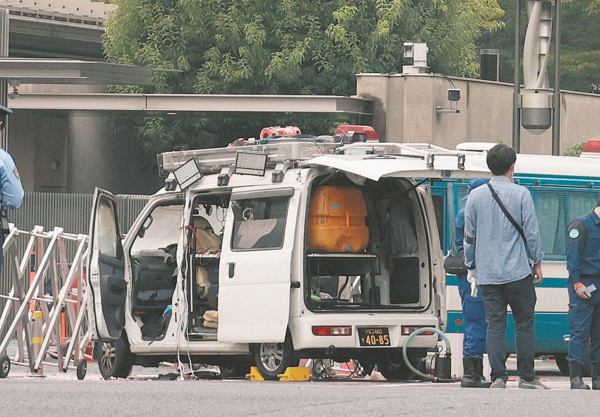 19日午前5時45分ごろ、東京都千代田区永田町の自民党本部の正門前で、軽ワゴン車で乗り付けた男が車を降り、火炎瓶を党本部に向け5回ほど投げた。男は車に乗って逃走。近くの首相官邸前の車両進入阻止の柵に突っ込み、警備中の警察官に向けて発煙筒を投げた。警視庁は公務執行妨害の疑いで男を現行犯逮捕した。党本部の門と警備車両の一部が焼けたが、けが人はいない。