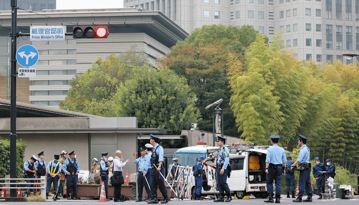 車が突っ込み騒然とする首相官邸前=19日午前(河口貞史撮影)
