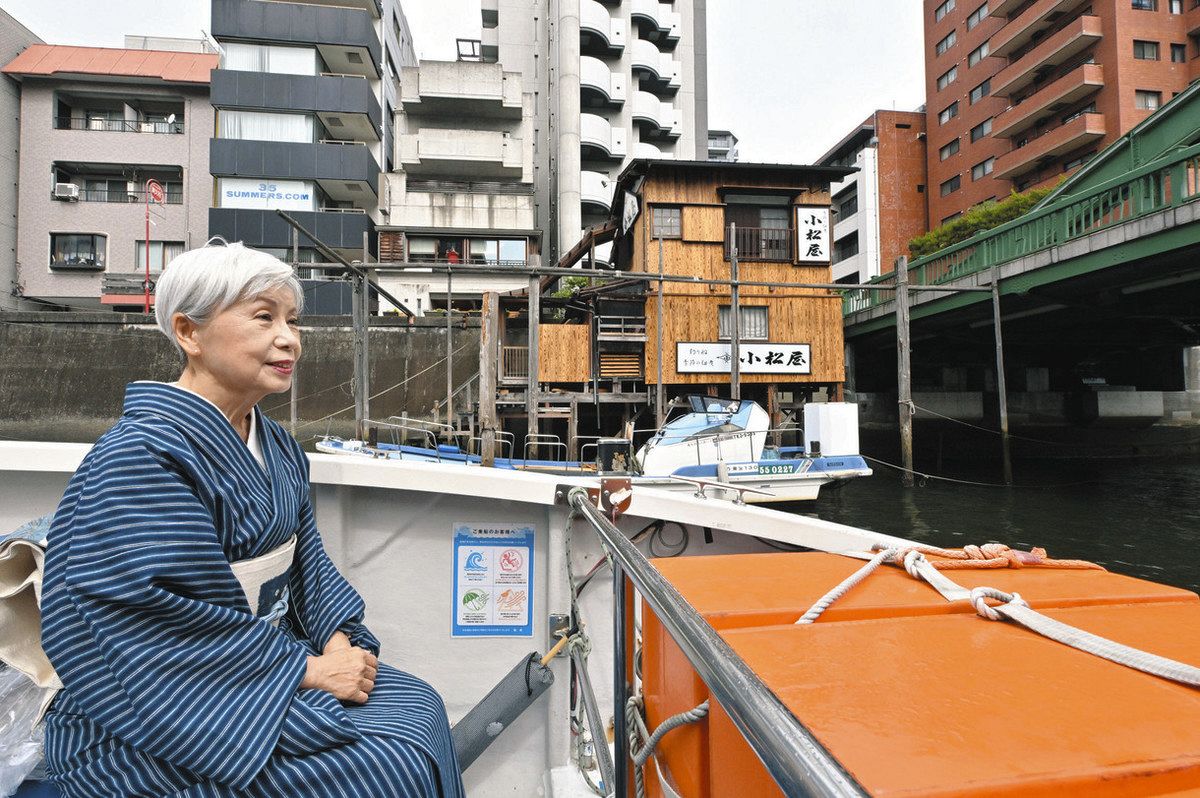 クルーズ船から神田川の柳橋を眺める田中優子さん=台東区、中央区で