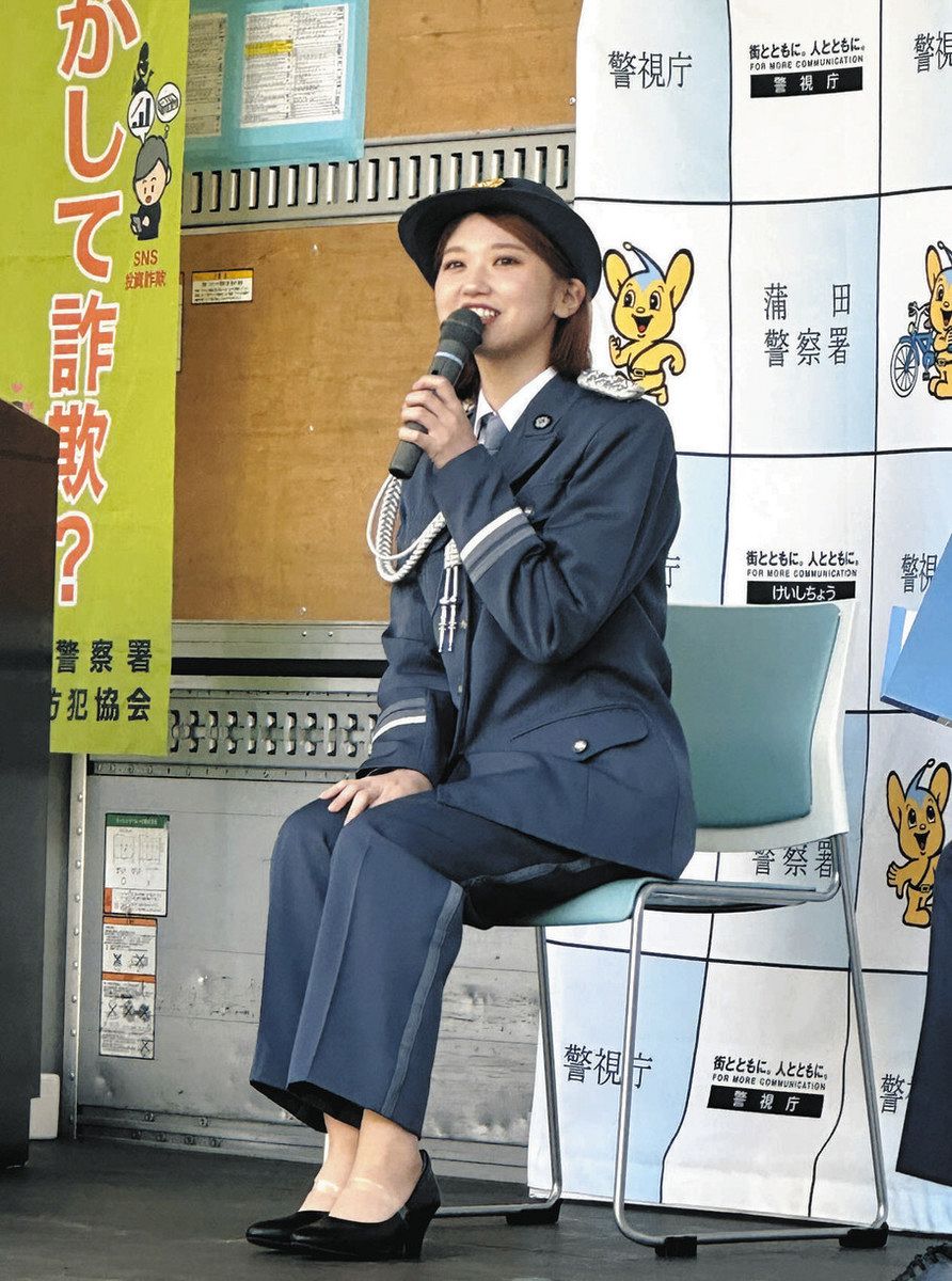 蒲田署は20日、一日署長にタレントの竹内朱莉(あかり)さんを迎え、東京都大田区のJR蒲田駅前でトークイベントを開いた。求人をうたいながら、首都圏で相次ぐ強盗事件への関与が疑われている「闇バイト」に応募しないよう注意を呼びかけた。