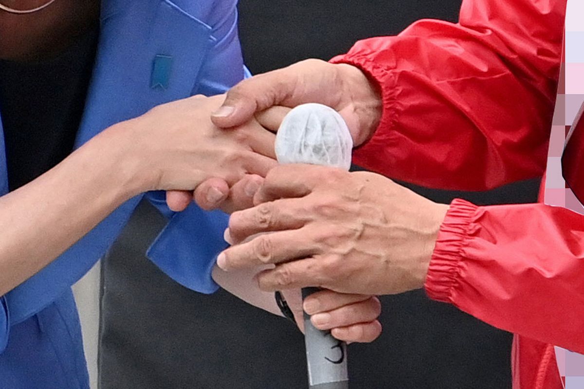 応援弁士と握手する候補者㊨ =17日、都内で(一部画像処理、中村千春撮影)