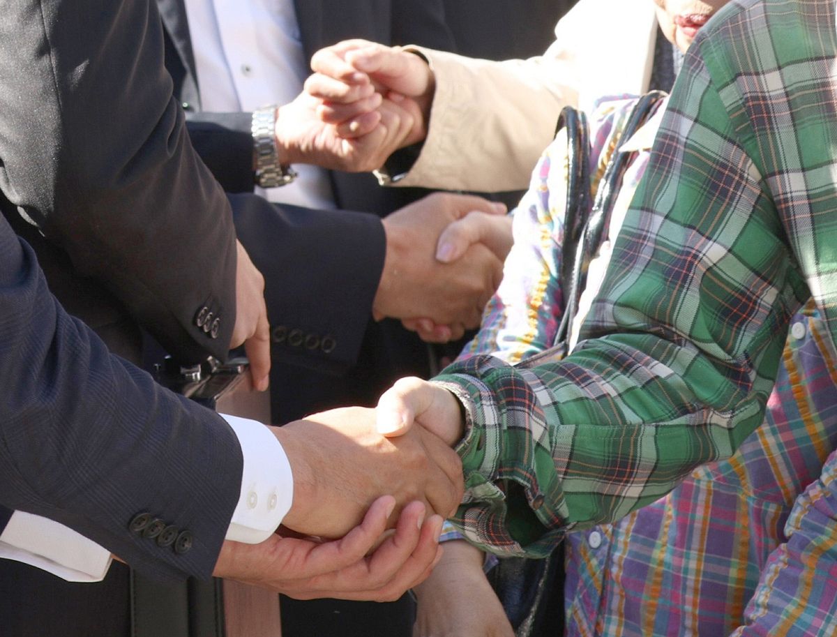 有権者と握手を交わす候補者=20日、都内で(市川知宏撮影)