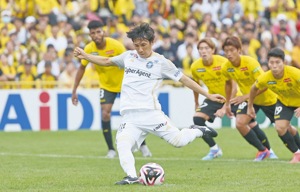 0-1のまま後半45分を経て追加タイムへ。味方が誘った反則で得たPKで、キッカーの大役を担った。外せば負けが濃厚どころか、勝ち点差6で追う頂点の座がさらに遠のく。そんな重圧下でも落ちついていた。「良いコースに、良い速さで」。そう言い聞かせると、フェイントを入れずに左足で右隅に蹴り込み、大歓声を巻き起こした。