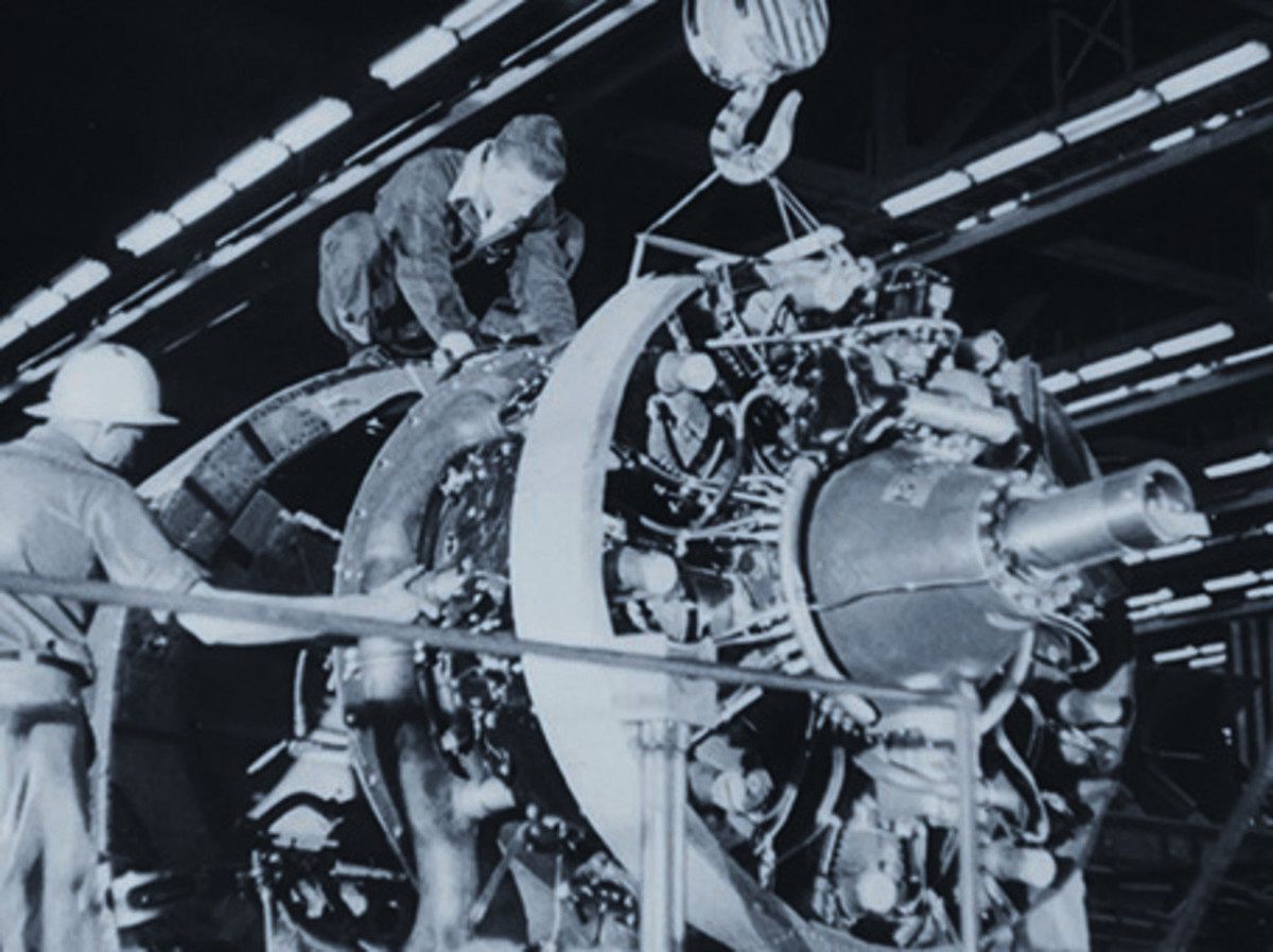 米軍の映画「Birth of the B-29」の一コマ。エンジンの組立の様子(いずれも米国立公文書館蔵、武蔵野ふるさと歴史館提供)