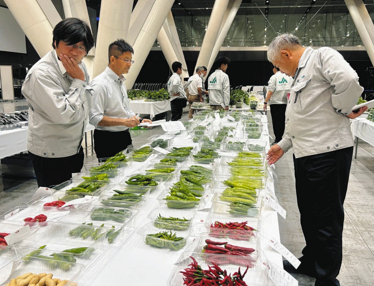 農産物の品質と農家の技術の向上を図り、毎年開いている。約500軒の農家が丹精した花や野菜、果物のほか、キノコや卵、農産加工品など約800点を出品した。品評会では都の普及指導員が農産物を手に取りながら、大きさや形がそろっているかなど、入念に確認していた。