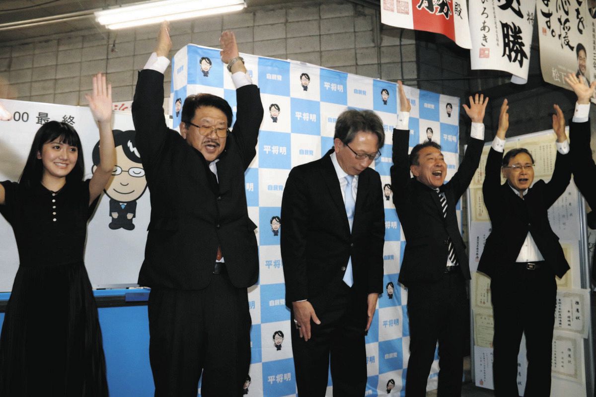 当選確実の報道を受け、支援者らに頭を下げる平将明さん(中央)=27日夜、東京都大田区で(米田怜央撮影)