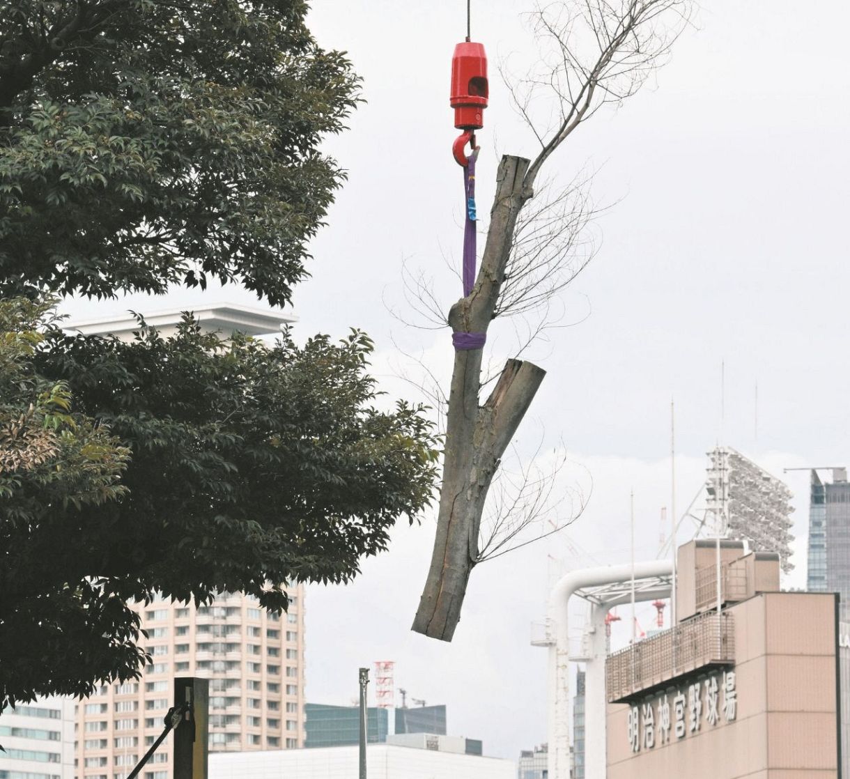 午後1時ごろ、神宮第二球場の解体工事現場で、ケヤキの幹や枝を作業員がチェーンソーで切断し、クレーン車で次々と運んだ。事業者代表の三井不動産によると、28日はケヤキとイヌツゲの計2本を伐採し、オガタマ1本を地区内に移植した。当面は同球場跡地で2026年初頭に着工する新ラグビー場建設に合わせ、71本の樹木を伐採、93本を移植する。