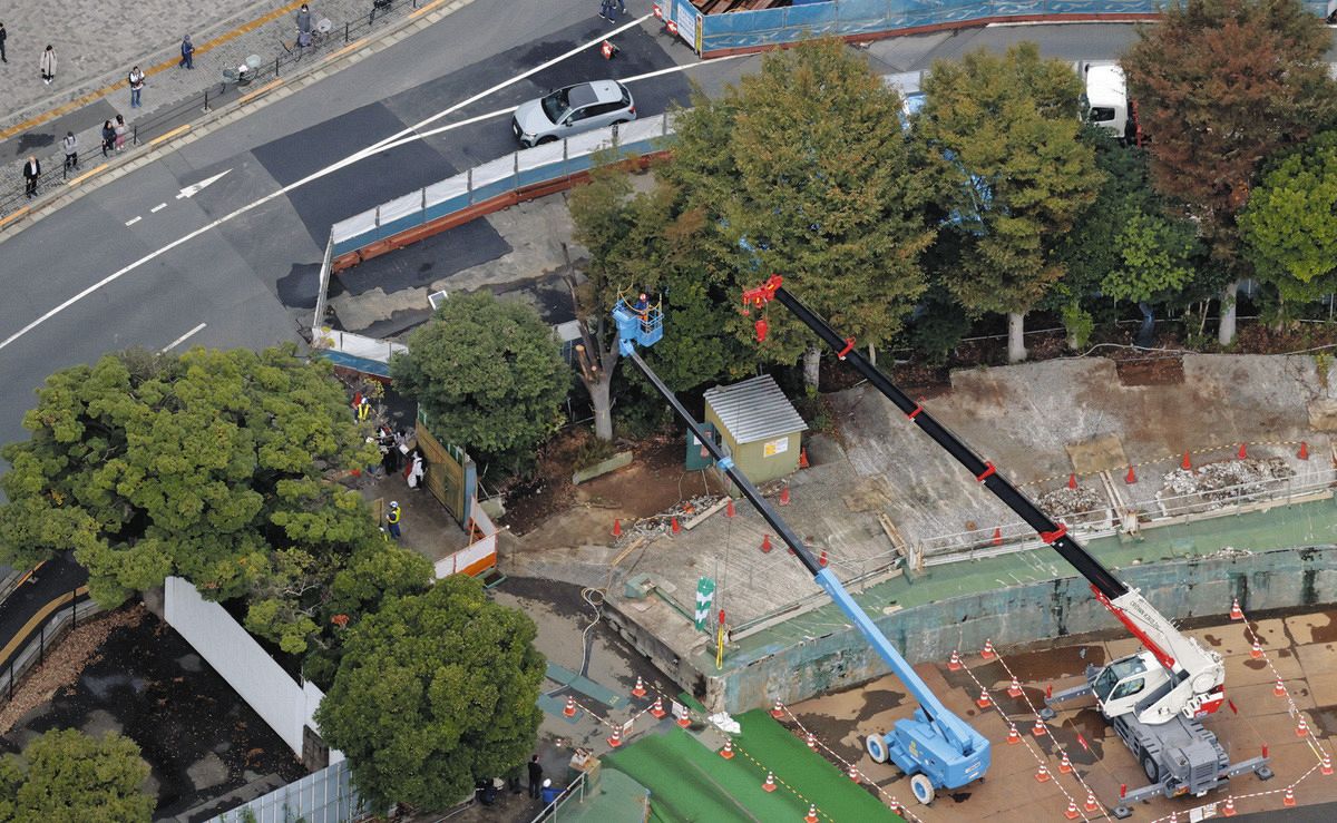 明治神宮外苑地区の再開発に向けて始まった樹木の伐採作業=28日、東京都新宿区で