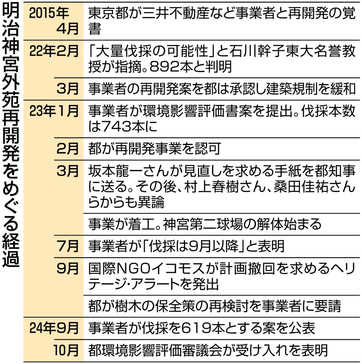 大量伐採は、2022年に日本イコモス国内委員会の石川幹子理事が調査で明らかにして以降、専門家や周辺住民、昨年亡くなった作曲家の坂本龍一さんら著名人が相次いで計画の見直しや撤回を求めた。