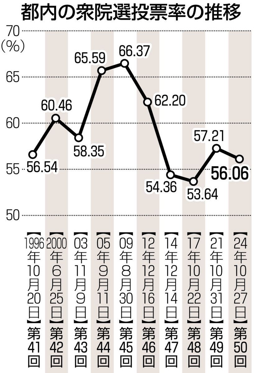 東京都選挙管理委員会は28日、衆院選(27日投開票)の都内小選挙区の投票率が56.06%だったと発表した。戦後4番目に低い水準となり、前回2021年(57.21%)から1.15ポイント下がった。4回連続で6割に届かなかった。全国平均の53.85%は上回った。