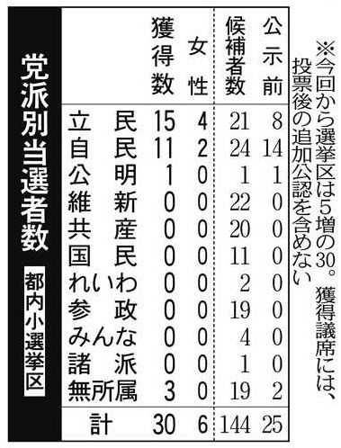 都内30の小選挙区では、立民が半数の15議席を得て躍進した。25選挙区だった2021年前回選では8議席だった。「支持政党なし」と答えた無党派層のうち、34・6%が立民候補に、16・4%が自民候補に投票していた。無党派層の比例代表の投票先は、立民が26・4%で最多となり、国民民主党20・8%と続いた。