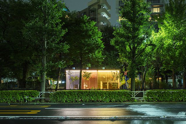 東京メトロ千代田線の代々木公園駅近くに位置し、調光フィルムを貼ったガラス張りの建物が印象的。扉が透けているデザインですが、中から鍵を閉めると不透明になる不思議な仕組み。そのためプライバシーは万全です。とくにトイレに入るときの2つの心配事である「中がキレイかどうか」「中に誰も隠れていないか」を事前に確認することができる利点があります。冬場は気温の低下により、不透明になるまで時間がかかってしまうため、10月中旬から5月中旬まではいつも不透明の状態で運用しています。