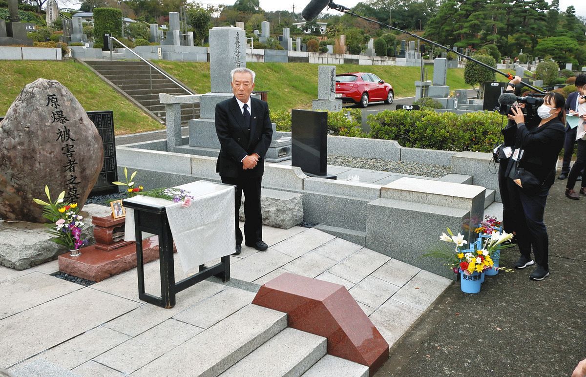 「原爆被害者の墓」の前で日本原水爆被害者団体協議会(被団協)のノーベル平和賞受賞決定を報告する家島昌志さん=東京都八王子市で