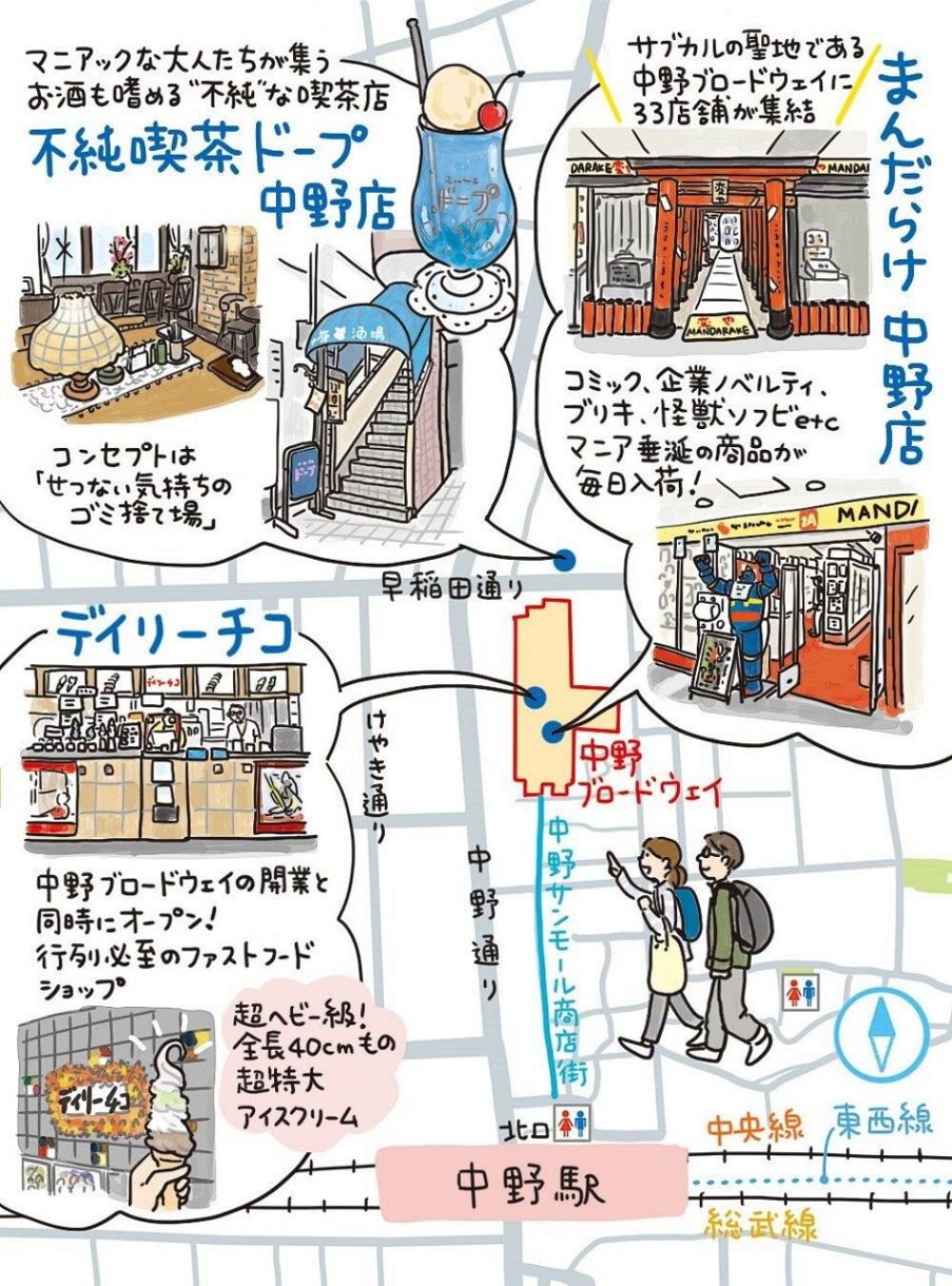中野ブロードウェイを中心に、アニメやマンガなどを扱う店が集まる「オタクの天国」を散策してみましょう。アニメやマンガ、フィギュアなどを扱う老舗「まんだらけ 中野店」を筆頭に、特大ソフトクリームが名物のファストフードショップ「デイリーチコ」、昭和レトロに彩られたカフェ「不純喫茶ドープ 中野店」を紹介します。