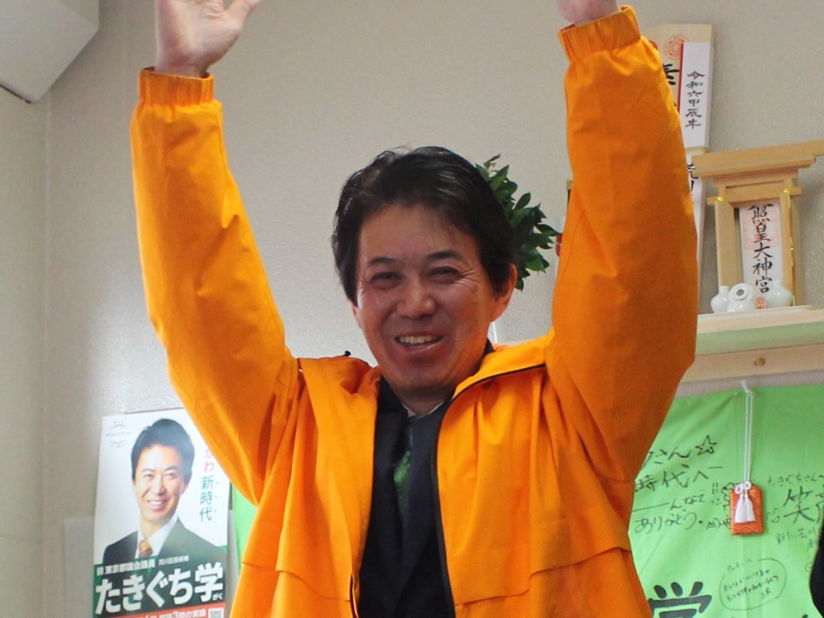 当選を決めて喜ぶ滝口学さん=11日、東京都荒川区で