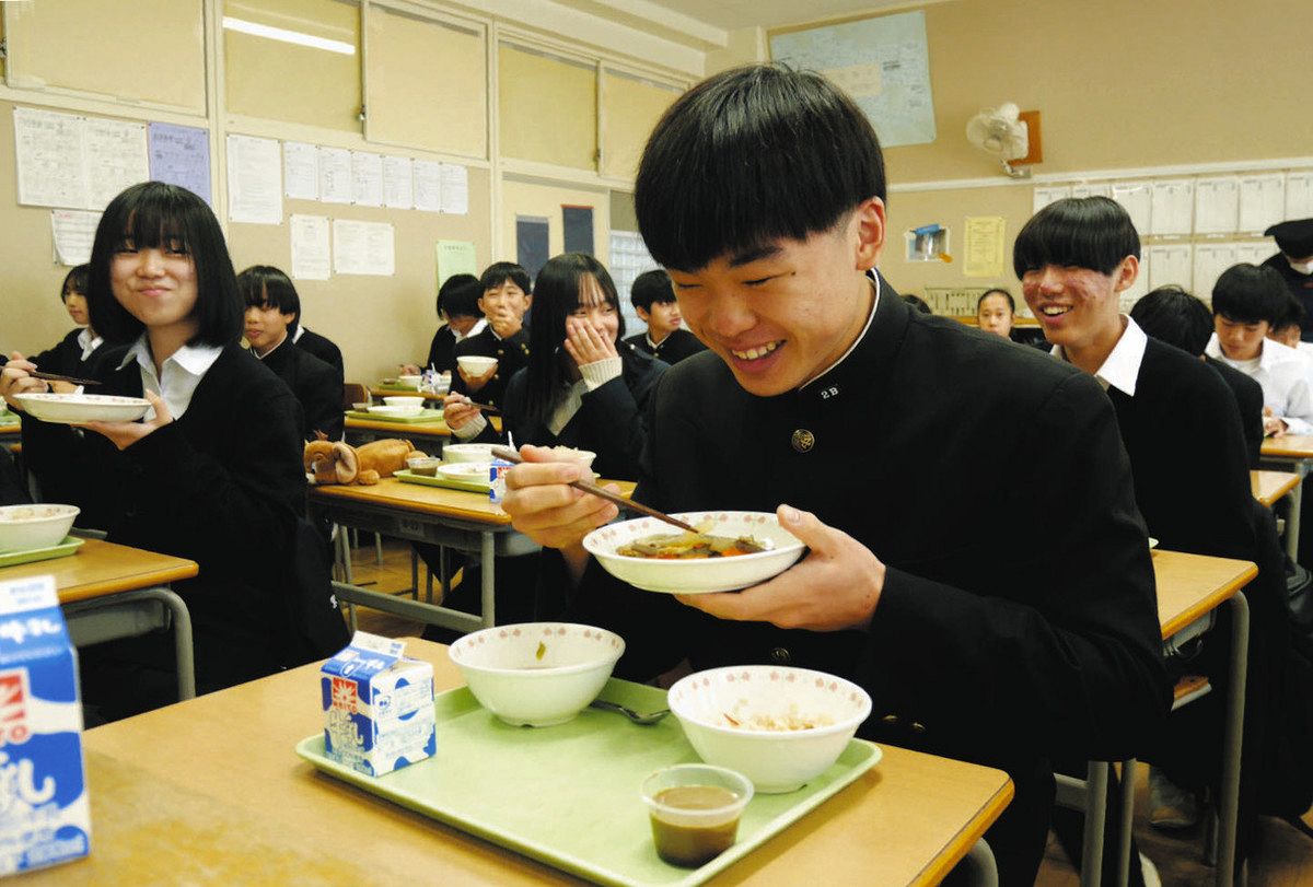 給食に出たのは、石川県能登町で取れたスルメイカのイカごはん、石川県産のダイコンやニンジンなどを煮た能登地域の郷土料理「あいまぜ」、石川県の家庭で食べられている豚汁「めった汁」など。生徒たちは「やわらかくて、おいしい」「イカの香りがすごい」など笑顔で味わった。