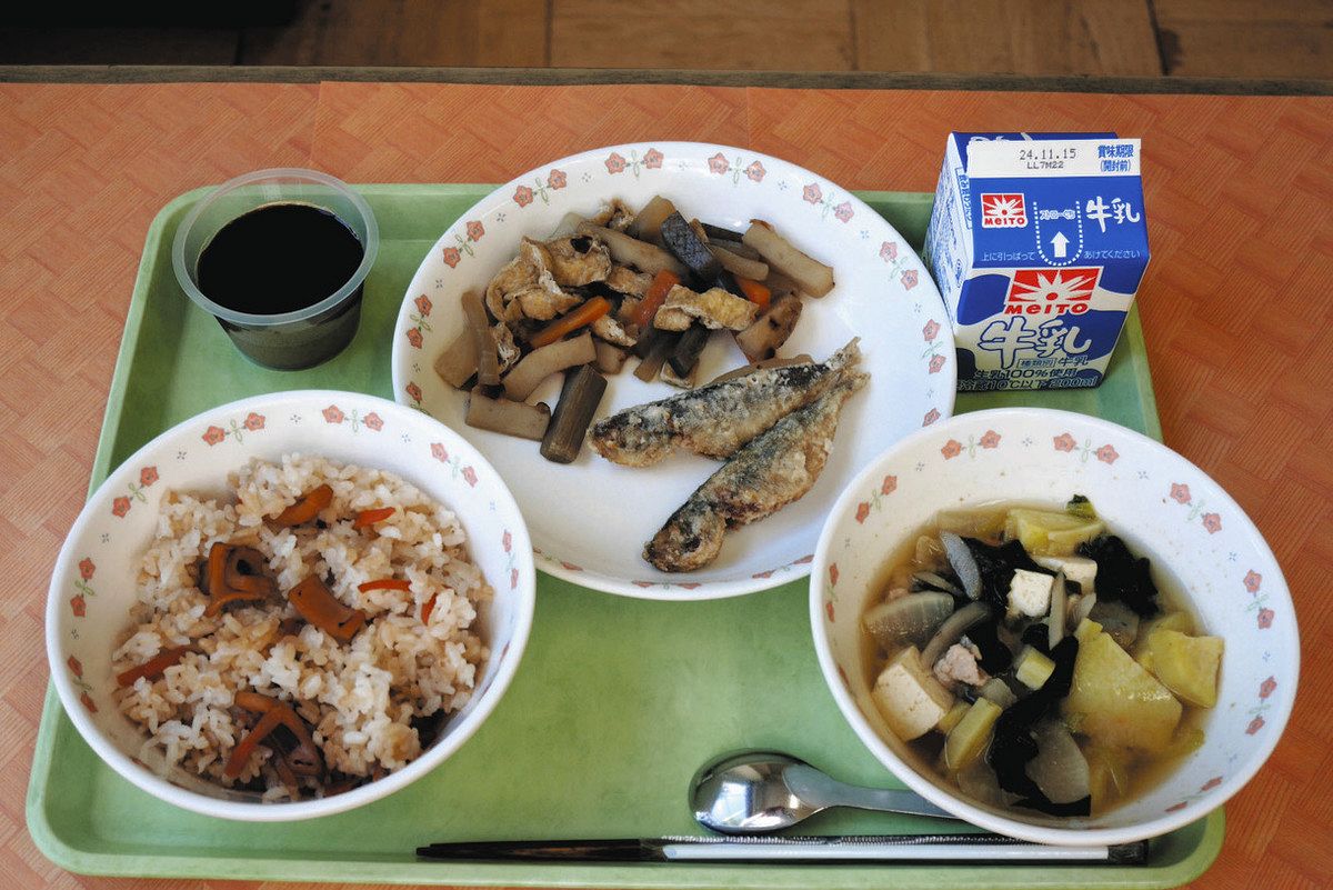 給食で提供されたイカごはん(左下)や郷土料理の煮物「あいまぜ」(中央上)