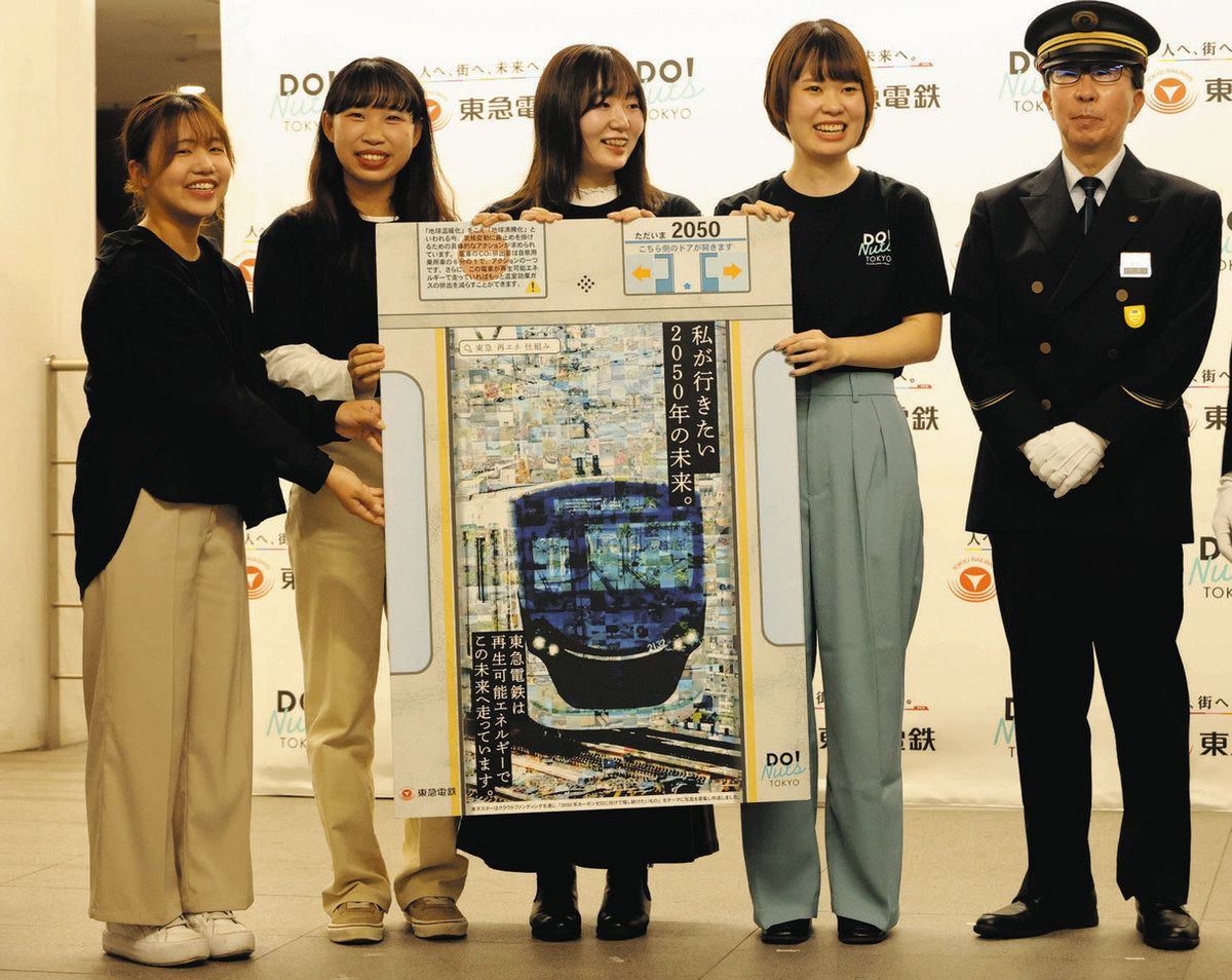 制作したのは、東京都環境局の選定事業で脱炭素社会の実現などに向けた取り組みをしている大学生5人。お披露目会が10月下旬、東急東横線渋谷駅で開かれ、ポスターを同駅の竹本光孝駅長に手渡した。出席した大学4年の阪田留菜さん(22)は「再生可能エネルギーを広めるために、行動に移す人や企業が増えてほしい」と話していた。