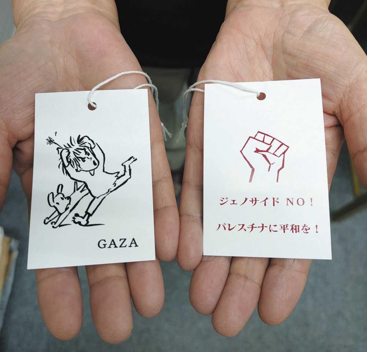 ストラップは縦7・5センチ、横5センチ。表面には攻撃から逃げている少女のイラスト、裏面には「ジェノサイドNO!パレスチナに平和を!」のメッセージが印刷されている。