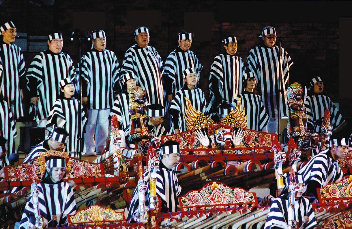 打楽器「ジェゴグ」の演奏と合唱を披露する芸能山城組=2022年