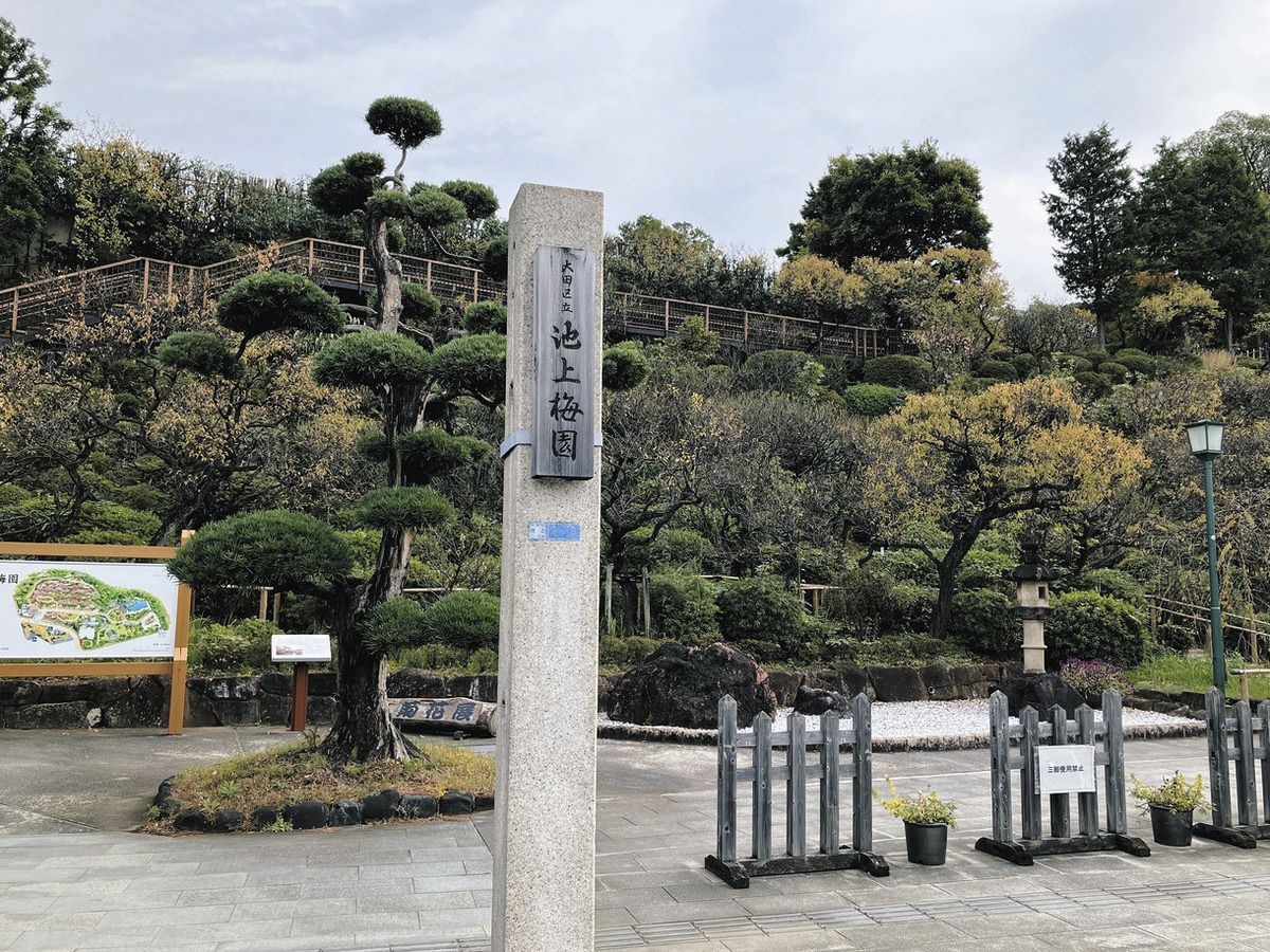 池上本門寺の西側にある。約30種の梅が見られ、期間限定でライトアップも実施している。梅のほかに、ロウバイ、ボタン、ツツジなど50種の樹木やフクジュソウ、スイセンなどがあり、四季を通じて楽しめる。また園内には、二つの茶室「聴雨庵(あん)」「清月庵」があるほか、水琴窟なども設置されており、存分に和の趣に浸れる。